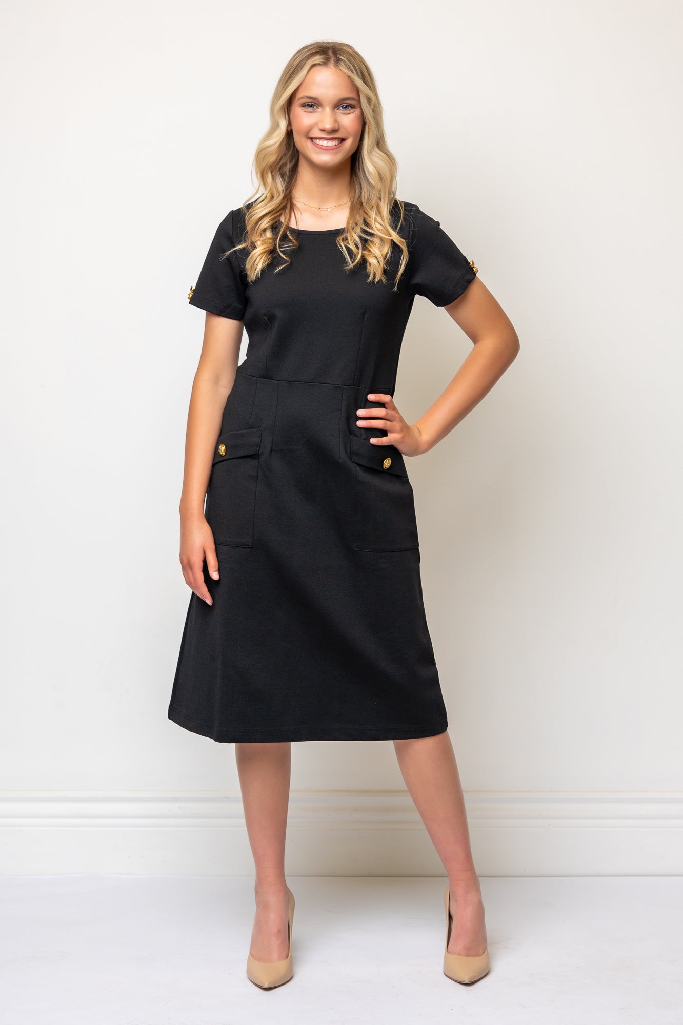 The Cecelia Dress is a standout piece in any wardrobe, offering timeless sophistication with modern charm. Constructed from a structured stretch knit ponte in timeless black or navy colorways, this wardrobe staple showcases a classic shift silhouette with impeccable shaping details. The fabric allows for a structured yet comfortable fit that maintains its shape beautifully. Short sleeves with classic gold buttons and petersham ribbon accents add to its tailored silhouette. Darts in the bodice and skirt provide the subtle shaping, while oversized front patch pockets with gold button detail infuse a little whimsy.